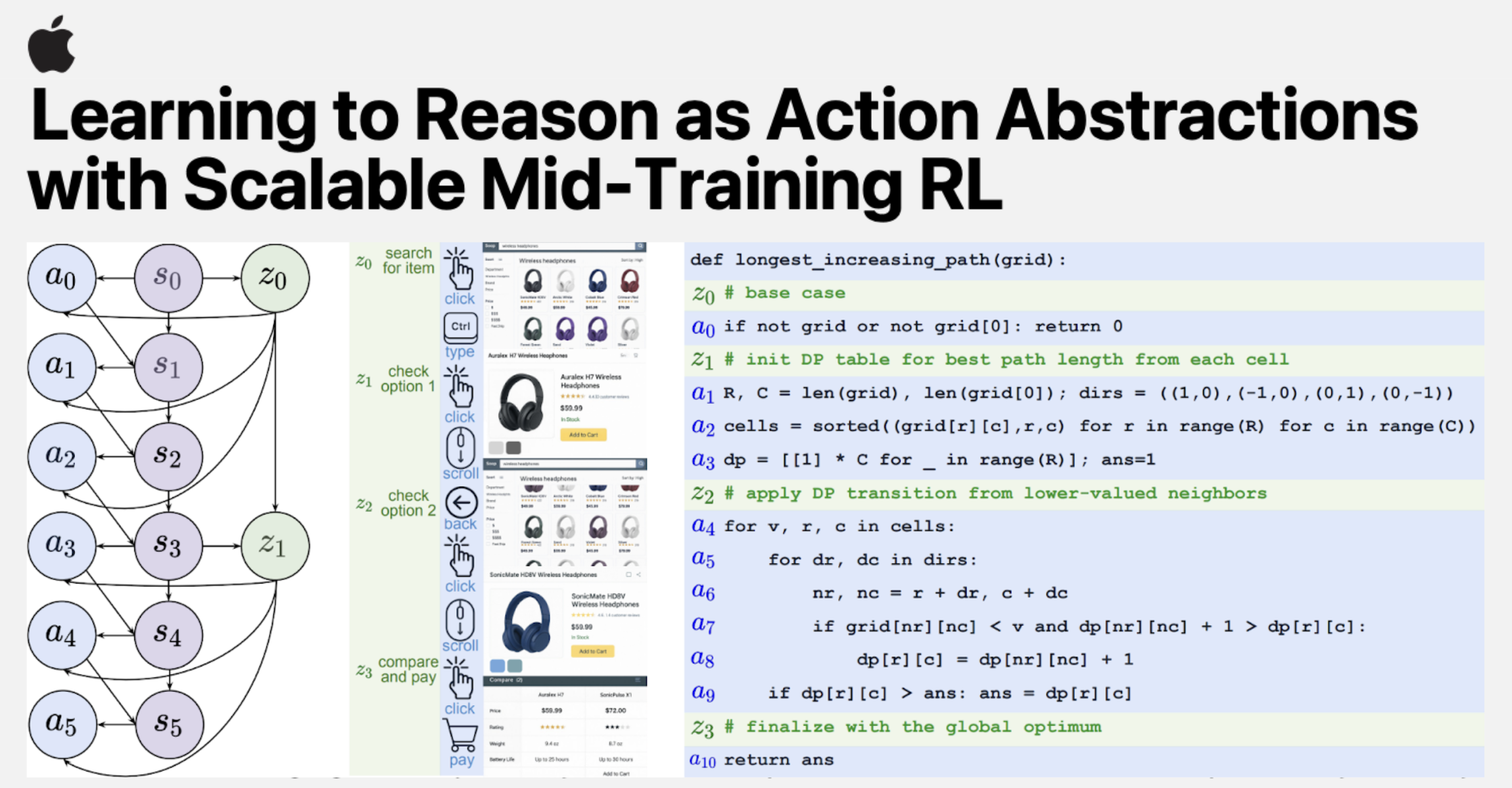 Learning to Reason as Action Abstractions with Scalable Mid-Training RL